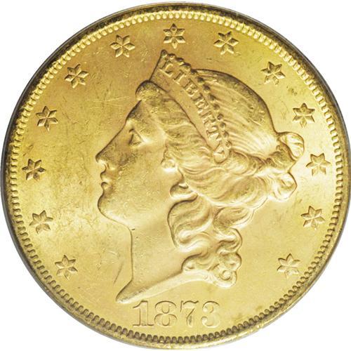 <B>1873 $20 Open 3 MS62 PCGS.</B></I> A lustrous and not unduly marked example that displays original orange and honey hues. Type Two double eagles are generally elusive in Uncirculated grades. The 1873 Open 3 issue is only slightly scarce at the MS62 grade level, but becomes very scarce any finer, especially at PCGS.<BR><BR><b>Shipping:</b> Coin/Currency (<a target="_blank" href="http://www.heritageauctions.com/common/shipping.php">view shipping information</a>)
