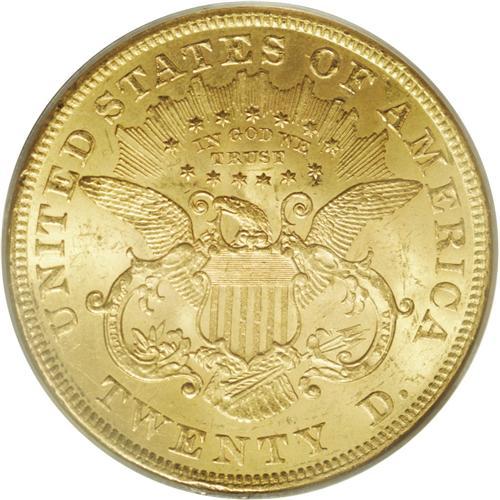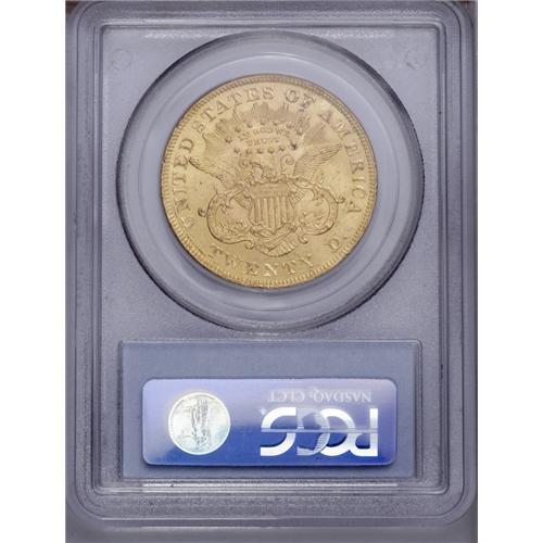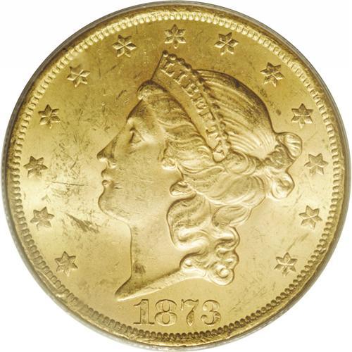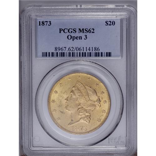 <B>1873 $20 Open 3 MS62 PCGS.</B></I> A moderately abraded piece with ample mint frost adhering to both sides. This bold impression leaves no detail undefined. Despite obvious signs of rough handling, this coin is quite attractive for the grade and displays a bright yellow-gold appearance. The Open 3 is the more common variety of this issue and, in addition, the most common Type Two double eagle.