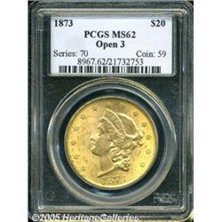 <B>1873 $20 Open 3 MS62 PCGS.</B></I> A very sharply struck Double Eagle with frosty green-gold luster. Light abrasions keep this just below the conditionally rare MS63 classification. The Type Two Double Eagles are considerably rarer in Mint State than either the Type One or the Type Three series.