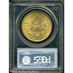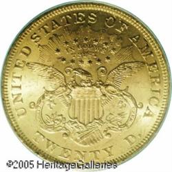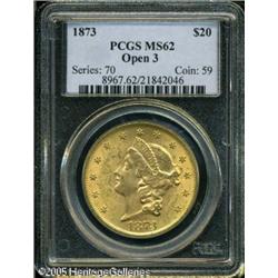 <B>1873 $20 Open 3 MS62 PCGS.</B></I> Flashy and lustrous with a sharp strike throughout. Most of these were held in banks overseas or possibly here in America soon after issue. Over the years most were heavily bagmarked, but technically still mint state. Few are found in grades above Mint State 60 or 61, and the numbers really drop off in Mint State 63 or finer for most dates from this era. For the collector, this coin has good eye appeal, moderate handling marks and is as nice as this date can generally be located. Lot:9072