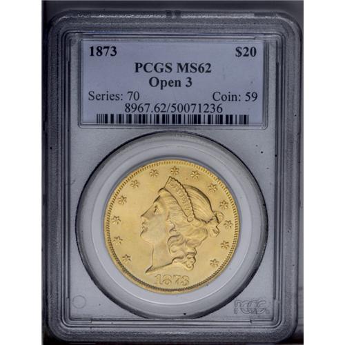<B>1873<$20> Open 3 MS62 PCGS.</B></I> Luscious, lustrous copper-gold surfaces with a tinge of hazel, blue, and green at the borders complement the strong strike and a modicum of minor marks. While the scintillating luster is this coin's most noticeable attribute, the bold strike leaves all star centrils well defined, and nearly all of the hair separated. The few light abrasions confirm the grade, but this coin is high-end for the designation. <BR><BR><B>Important notice:</B> Heritage usually auctions material at the rate of 200-250 lots per hour. On some occasions eBay Live bid software or the Internet may not be able to keep up with the pace of the auction. We recommend placing a realistic absentee bid now as insurance to avoid disappointment. Occasionally the auctioneer may eliminate or reject an eBay Live bid, and the auctioneer may also reopen a lot after the close of the eBay live bidding (usually because we missed an audience bid), and may reject your bid even if it shows you as the winning bidder. By bidding via eBay Live, you agree that Heritage may award the lot to another bidder at its sole discretion under the circumstances described above or any other reasonable circumstances. Since eBay bids are not shown to us until we open the lot on the floor, we treat those bids just like floor bids. In most cases the floor responds before the eBay bid is presented to us, due to Internet lag time, so for consistency we have made it a policy that floor bids are always considered first over tie eBay live bids. Also please note that all Heritage lots purchased through eBay Live carry a 20% Buyer's Premium. Please make sure you read the Terms and Conditions before you bid. This lot is being auctioned in conjunction with a live floor auction by Heritage Galleries & Auctioneers. All final auction and invoice information will be supplied by Heritage Galleries & Auctioneers, and all other information should be considered preliminary. Lot:4244 <BR><BR><B>Winning Notification and Billing:</B> After the FINAL session in this auction is complete, Heritage will send e-mail and snail mail invoices. This process normally takes several days. All final auction and invoice information will be supplied by Heritage Galleries & Auctioneers, and all other information should be considered preliminary. <BR><BR>This auction will be conducted on a live auction floor and over the Internet through eBay Live. If you choose to place an absentee bid, please take a moment to <font color='#0000ff'><u><a href='http://pages.ebay.com/liveauctions/help/before/laabsentee.html'>learn how eBay Live absentee bidding works</a></u></font><font color='#000000'>