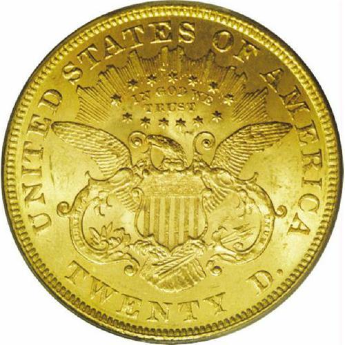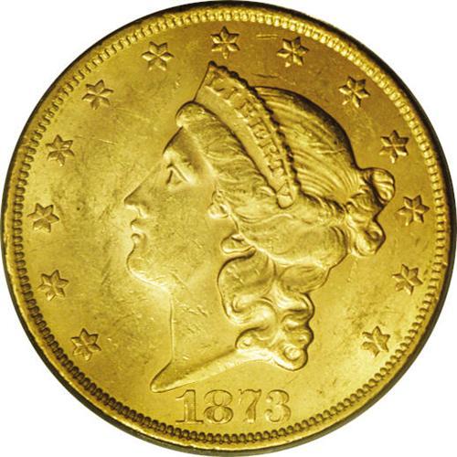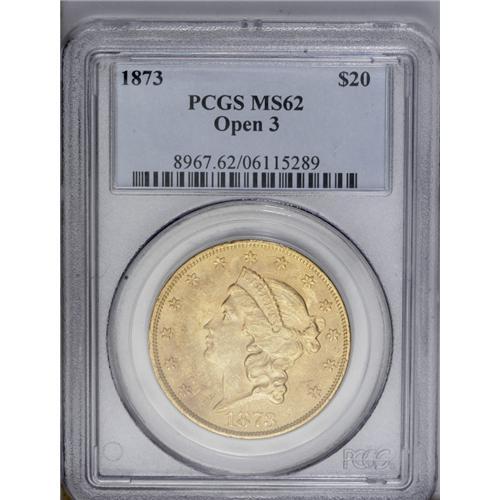 <B>1873<$20> Open 3 MS62 PCGS.</B></I> Satiny with ample mint frost over the devices tempered by scuffy abrasions in the obverse fields. Type collectors seeking a Type Two twenty have long been drawn to the 1873 Open 3 because of its relative obtainability in Mint State.