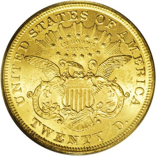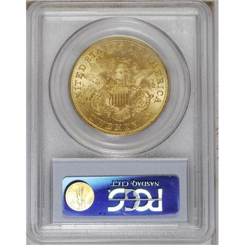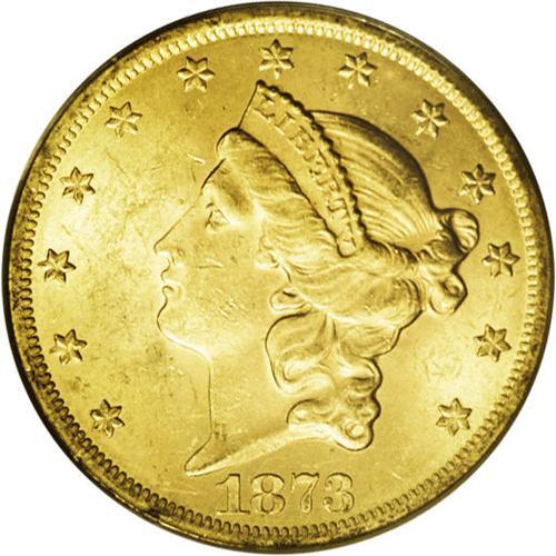 <B>1873<$20> Open 3 MS62 PCGS.</B></I> The most available of the Type Two double eagles, here represented by an attractive orange-gold example with some darker coloration near the rims. The moderately abraded surfaces are consistent with an MS62 grade, and the strike is pleasing on this piece. A nice candidate for a type set.