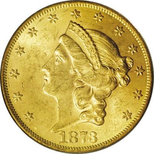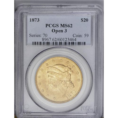 <B>1873<$20> Open 3 MS62 PCGS.</B></I> The obverse has received the brunt of the abrasions on this sharply detailed example. Typically satiny with an attractive reddish tint.