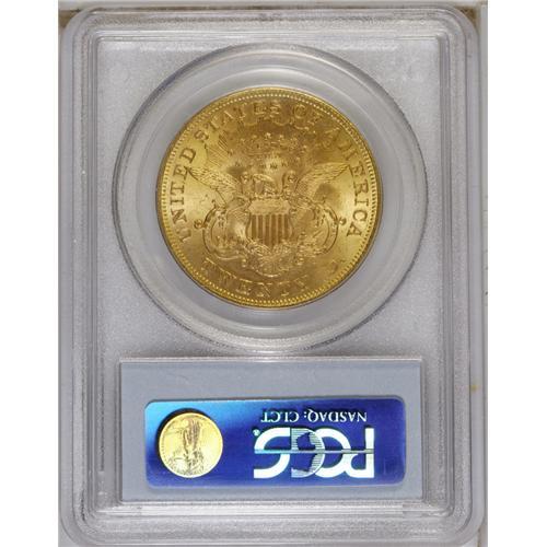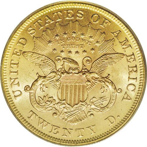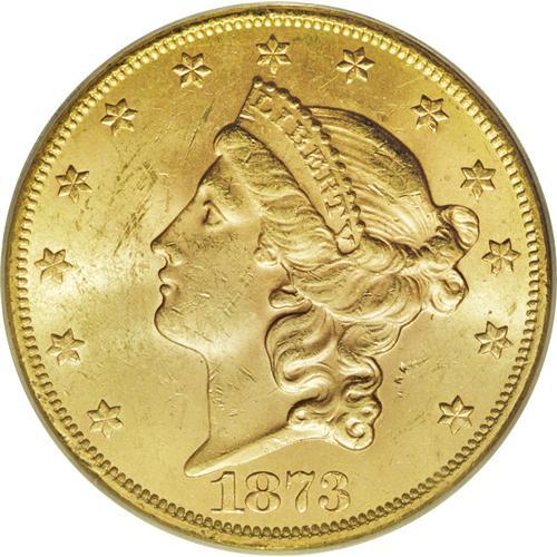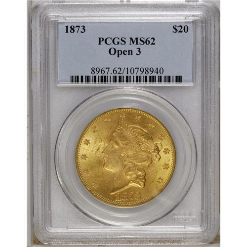 <B>1873 $20 Open 3 MS62 PCGS.</B></I> This issue is common for the type, especially in grades of VF to AU condition. The MS62 example offered in this lot displays honey-gold surfaces with soft luster, along with adequately struck design features. A few minute abrasions and scuffs are noted, especially on the obverse.<BR><BR><b>Shipping:</b> Coins & Currency (<a target="_blank" href="http://www.heritageauctions.com/common/shipping.php">view shipping information</a>)
