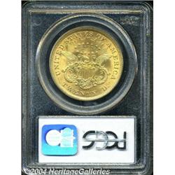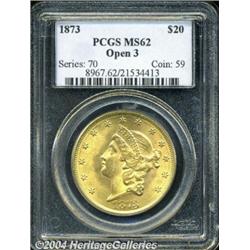 <B>1873<$20> Open 3 MS62 PCGS.</B></I> Well defined for this most prolific Type Two issue, with pleasing color and satiny-textured surfaces. A series of tiny facial marks are revealed under light magnification. <BR><BR><B>Important notice:</B> Heritage usually auctions material at the rate of 200-250 lots per hour. On some occasions eBay Live bid software or the Internet may not be able to keep up with the pace of the auction. We recommend placing a realistic absentee bid now as insurance to avoid disappointment. Occasionally the auctioneer may eliminate or reject an eBay Live bid, and the auctioneer may also reopen a lot after the close of the eBay live bidding (usually because we missed an audience bid), and may reject your bid even if it shows you as the winning bidder. By bidding via eBay Live, you agree that Heritage may award the lot to another bidder at its sole discretion under the circumstances described above or any other reasonable circumstances. Since eBay bids are not shown to us until we open the lot on the floor, we treat those bids just like floor bids. In most cases the floor responds before the eBay bid is presented to us, due to Internet lag time, so for consistency we have made it a policy that floor bids are always considered first over tie eBay live bids. Also please note that all Heritage lots purchased through eBay Live carry a 20% Buyer's Premium. Please make sure you read the Terms and Conditions before you bid.