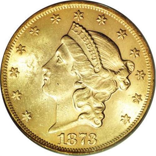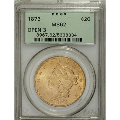 <B>1873 $20 Open 3 MS62 PCGS.</B></I> The most common Type Two double eagle, due to its large mintage and generous survival rates, yet one that is enduringly popular. This piece offers a bold strike and distraction-free surfaces, with radiant luster and marvelous orange-gold coloration. Certified in a green-label holder.<BR><BR><B>Coin Engraver:</B> James B. Longacre<BR><BR><b>Shipping:</b> Coins & Currency (<a target="_blank" href="http://www.heritageauctions.com/common/shipping.php">view shipping information</a>)