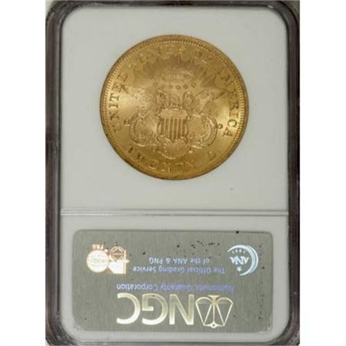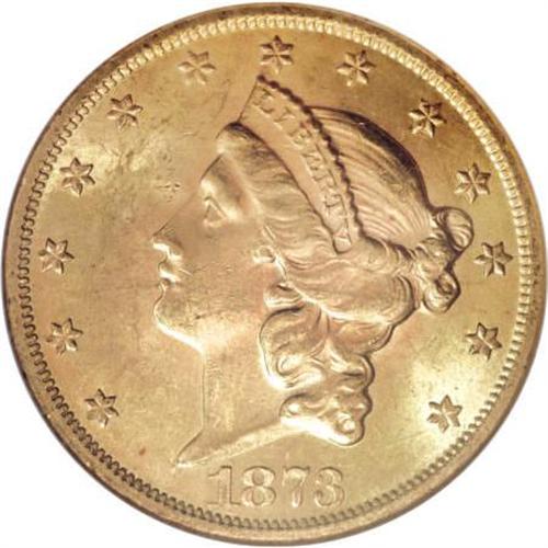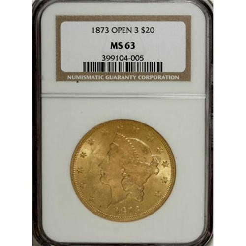 <B>1873 $20 Open 3 MS63 NGC.</B></I> In addition to being more available than its Closed 3 counterpart in all grades, the Open 3 double eagle is the only variety to have an appreciable number of examples certified as Select or better. This MS63 piece has pleasing detail and blushes of peach against the apricot-orange surfaces. Appealing despite light abrasions. NGC has graded just two finer Open 3 pieces (7/07).<BR><BR><B>Coin Engraver:</B> James B. Longacre<BR><BR><b>Shipping:</b> Coins & Currency (<a target="_blank" href="http://www.heritageauctions.com/common/shipping.php">view shipping information</a>\)