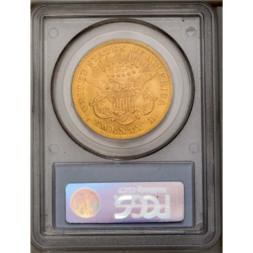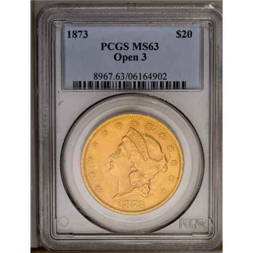 <B>1873<$20> Open 3 MS63 PCGS.</B></I> Every date in the Type Two Liberty double eagle series is a condition rarity, without exception. As one of the most common dates, this issue is typical, with a total PCGS population in all grades exceeding 3,300 coins, and yet just 90 of those are MS63 and only five are finer. Indeed, the entire type, which consists of 29 different date and mintmark combinations, boasts a PCGS population of only 285 MS63 examples, and just 50 finer coins, representing less than 2% of the combined PCGS population for all dates in all grades. Compared to the recent treasure discoveries of the Type One design, and the constant supply of the Type Three design, the importance and rarity of the Type Two coins yields what may be a substantially underpriced issue.<BR> This remarkable Mint State specimen has brilliant and frosty yellow-gold luster with hints of pale orange toning. A few scattered abrasions are evident on each side, and they are completely consistent with the grade. Population: 90 in 63, 5 finer (6/06).