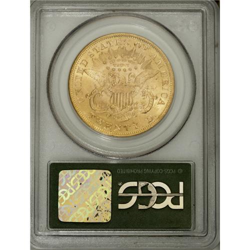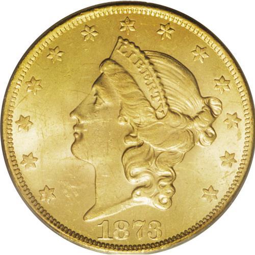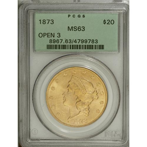 <B>1873 $20 Open 3 MS63 PCGS.</B></I> The Open 3 is the more common of the two 1873 varieties. The obverse die shows minor doubling, particularly on LIBERTY. Bright and lustrous with clean surfaces and plenty of eye appeal. This is a decently struck coin, despite partial weakness on four or five of the obverse stars. It shows flashy yellow-gold color throughout and excellent surfaces for the assigned grade. According to Garrett and Guth: "In Mint State this issue is scarce, as are all Type 2 double eagles. Most are in grades of MS-60 to MS-61. Choice examples are actually quite rare and seldom available. Just a few examples are known above MS-63. A PCGS MS-63 coin sold in May 2005 for $9,200." Population: 95 in 63, 5 finer (11/06).<BR><I>From The Freedom Collection.</B></I><BR><BR><b>Shipping:</b> Coin/Currency (<a target="_blank" href="http://www.heritageauctions.com/common/shipping.php">view shipping information</a>)