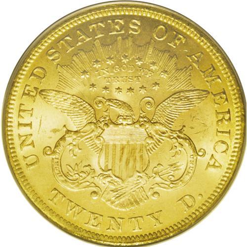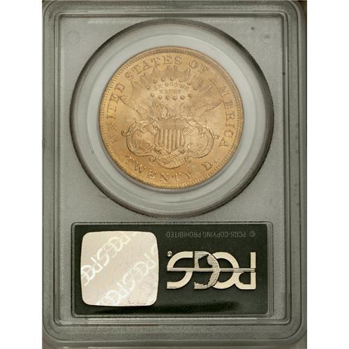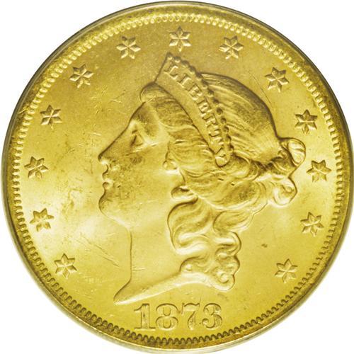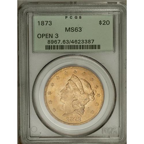 <B>1873<$20> Open 3 MS63 PCGS.</B></I> There is no doubt that this is the most common issue among all Type Two double eagles, yet it is a conditional rarity that is seldom found any nicer than this example, as clearly indicated by the population data. The date is large, from a four-digit date logotype, and it is slightly low. The digit 1 is closer to the border with twice the space between the top of the 1 and the bust. The initial J is centered over the digit 8. This is a frosty example with brilliant honey-gold coloration and minimally abraded surfaces. The most noticeable blemish, and perhaps the only grade limiting feature, is a small scrape in the lower left obverse field. Otherwise, the surfaces are remarkably fresh and pleasing. Population: 91 in 63, 5 finer (7/06).