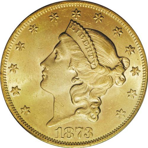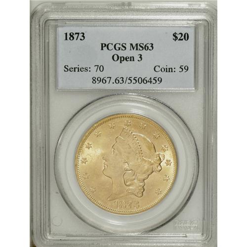 <B>1873 $20 Open 3 MS63 PCGS.</B></I> This Type Two double eagle issue is considered a common date in the context of this short-lived design type. However, in MS63 grade it is an important condition rarity as the PCGS population data shows. Both sides have soft, frosty luster with brilliant yellow-gold color and few abrasions.<BR> Of the basic types of double eagles, the Type Two design, with the addition of the IN GOD WE TRUST motto on the reverse and the denomination abbreviated TWENTY D., is considerably rarer in Mint State grades than either the Type One or Type Three designs. The Type Three design is common due to substantial hoards from Europe and elsewhere. The Type One design is available thanks to three important treasure discoveries. But the Type Two double eagles did not figure in many European holdings, and had not been minted when the treasure ships went down. Population: 95 in 63, 5 finer (11/06).<BR><BR><b>Shipping:</b> Coin/Currency (<a target="_blank" href="http://www.heritageauctions.com/common/shipping.php">view shipping information</a>)