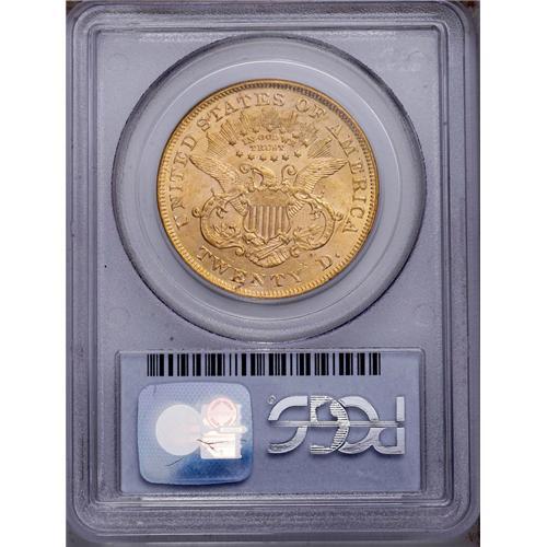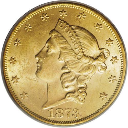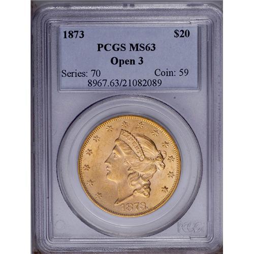 <B>1873 $20 Open 3 MS63 PCGS.</B></I> This apricot-gold type coin exhibits a relatively clean appearance, and the strike is crisp throughout. No unpleasant marks are detected, and the cheek is refreshingly smooth. The finest collectible grade for the issue, since just seven pieces have been certified finer, by both services combined, as of (4/07).<BR><BR><b>Shipping:</b> Coins & Currency (<a target="_blank" href="http://www.heritageauctions.com/common/shipping.php">view shipping information</a>)
