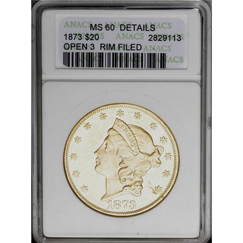 <B>1873<$20> Open 3--Rim Filed--ANACS. MS60 Details.</B></I> The reverse rim is filed between 9 o'clock and 1 o'clock. A mildly prooflike and sharply struck Type Two double eagle with fewer bagmarks than generally encountered. A wisp of struck-in grease is seen near the final star. <BR><BR><B>Important notice:</B> Heritage usually auctions material at the rate of 200-250 lots per hour. On some occasions eBay Live bid software or the Internet may not be able to keep up with the pace of the auction. We recommend placing a realistic absentee bid now as insurance to avoid disappointment. Occasionally the auctioneer may eliminate or reject an eBay Live bid, and the auctioneer may also reopen a lot after the close of the eBay live bidding (usually because we missed an audience bid), and may reject your bid even if it shows you as the winning bidder. By bidding via eBay Live, you agree that Heritage may award the lot to another bidder at its sole discretion under the circumstances described above or any other reasonable circumstances. Since eBay bids are not shown to us until we open the lot on the floor, we treat those bids just like floor bids. In most cases the floor responds before the eBay bid is presented to us, due to Internet lag time, so for consistency we have made it a policy that floor bids are always considered first over tie eBay live bids. Also please note that all Heritage lots purchased through eBay Live carry a 20% Buyer's Premium. Please make sure you read the Terms and Conditions before you bid. This lot is being auctioned in conjunction with a live floor auction by Heritage Galleries & Auctioneers. All final auction and invoice information will be supplied by Heritage Galleries & Auctioneers, and all other information should be considered preliminary. Lot:4242 <BR><BR><B>Winning Notification and Billing:</B> After the FINAL session in this auction is complete, Heritage will send e-mail and snail mail invoices. This process normally takes several days. All final auction and invoice information will be supplied by Heritage Galleries & Auctioneers, and all other information should be considered preliminary. <BR><BR>This auction will be conducted on a live auction floor and over the Internet through eBay Live. If you choose to place an absentee bid, please take a moment to <font color='#0000ff'><u><a href='http://pages.ebay.com/liveauctions/help/before/laabsentee.html'>learn how eBay Live absentee bidding works</a></u></font><font color='#000000'>