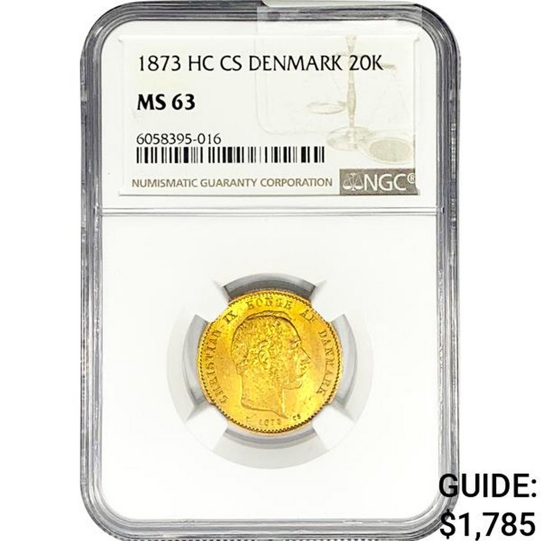 1873 .2593oz. Gold HC CS Denmark 20 Kroner NGC MS6