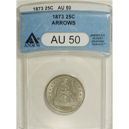 <B>1873 25C Arrows AU50 ANACS.</B></I> NGC Census: (5/148). PCGS Population (6/162). Mintage: 1,271,700. Numismedia Wsl. Price for NGC/PCGS coin in AU50: $350. (#5491)<BR><BR><b>Shipping:</b> Coins & Currency (<a target="_blank" href="http://www.heritageauctions.com/common/shipping.php">view shipping information</a>)