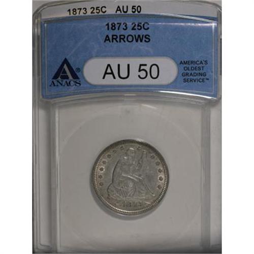 <B>1873 25C Arrows AU50 ANACS.</B></I> NGC Census: (5/155). PCGS Population (7/168). Mintage: 1,271,700. Numismedia Wsl. Price for NGC/PCGS coin in AU50: $350. (#5491)<BR><BR><B>Coin Engraver:</B> Christian Gobrecht<BR><BR><b>Shipping:</b> Coins & Currency (<a target="_blank" href="http://www.heritageauctions.com/common/shipping.php">view shipping information</a>)