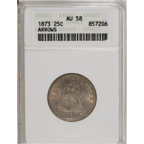<B>1873 25C Arrows AU58 ANACS.</B></I> NGC Census: (34/100). PCGS Population (26/117). Mintage: 1,271,700. Numismedia Wsl. Price for NGC/PCGS coin in AU58: $475. (#5491)<BR><BR><B>Coin Engraver:</B> Christian Gobrecht<BR><BR><b>Shipping:</b> Coins & Currency (<a target="_blank" href="http://www.heritageauctions.com/common/shipping.php">view shipping information</a>)