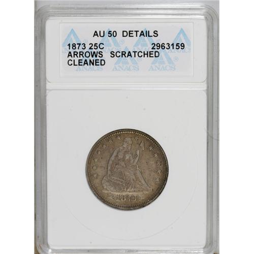 <B>1873 25C Arrows--Cleaned, Scratched--ANACS. AU50 Details.</B></I> NGC Census: (10/296). PCGS Population (6/163). Mintage: 1,271,700. Numismedia Wsl. Price for NGC/PCGS coin in AU50: $350. (#5491)<BR><BR><b>Shipping:</b> Coins & Currency (<a target="_blank" href="http://www.heritageauctions.com/common/shipping.php">view shipping information</a>)