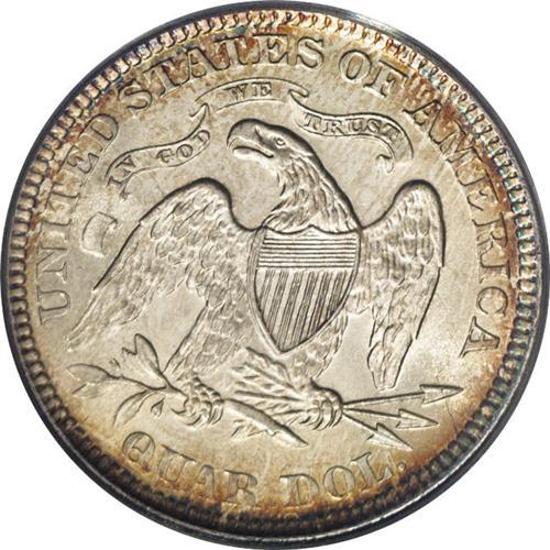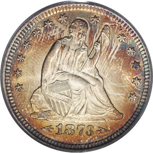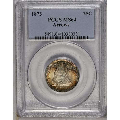 <B>1873<25C> Arrows MS64 PCGS.</B></I> An attractive near-Gem example of the popular No Arrows type, showing abundant luster underneath light copper-gold patination on the obverse, with a narrow ring of color on the reverse. Some light, faded clash marks are seen on both sides, and the scroll on the reverse shows some weakness from die lapping. Despite the advanced state of the dies, this example is well struck and largely free of mentionable post-minting distractions. Population: 24 in 64, 16 finer (6/06).