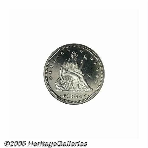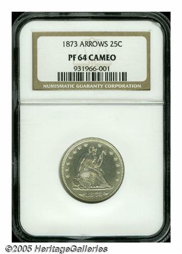 <B>1873<25C> Arrows PR64 Cameo NGC.</B></I> First year of the brief design that was modified with the addition of arrowheads on each side of the date. The Mint struck 540 proofs, but the desirability of this limited type makes the proofs struck this year much pricier than proofs struck in years with similar mintages. This Choice specimen is untoned and features deep, glassy brilliance as a background for frosted design elements. Population: 2 in 64 Cameo, 2 finer (6/05).