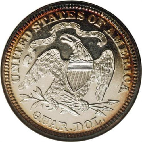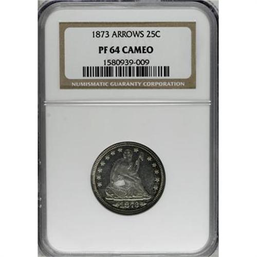<B>1873 25C Arrows PR64 Cameo NGC.</B></I> Arrows were placed alongside the date, in 1873 and 1874, to denote an increase in weight from 96 to 96.45 grains. These were removed in 1875 , resulting in a two-year type that is understandably popular with collectors. This attractive proof is well struck and nicely preserved, with glassy mirrored fields and frosted icy-white devices. Speckled red-russet and cobalt-blue iridescence enhances the peripheries. A few faint hairlines are noted in the fields, and a single small contact mark rests alongside Liberty's left (facing) shoulder. Census: 5 in 64 Cameo, 3 finer (6/07). <BR><I>From The Laguna Niguel Collection, Part One.</B></I><BR><BR><b>Shipping:</b> Coins & Currency (<a target="_blank" href="http://www.heritageauctions.com/common/shipping.php">view shipping information</a>\)