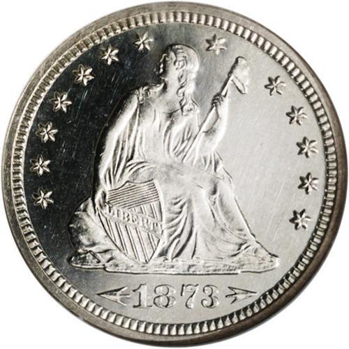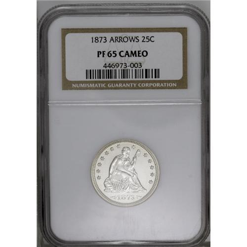 <B>1873<25C> Arrows PR65 Cameo NGC.</B></I> The right arrowhead is slightly tilted upward, and the reverse has minute die scratches below the G in GOD, and within the eagle's neck feathers. The right (facing) border of the shield is doubled. An essentially brilliant Gem that has obvious cameo contrast on both sides. A small strike-thru affects the bottom left portion of the upright of the E in AMERICA, and provides a pedigree marker for this high grade example. Only 540 pieces were struck. Census: 1 in 65 Cameo, 1 finer (3/06).<BR><I>From The David L. Goodwin Collection.</B></I>