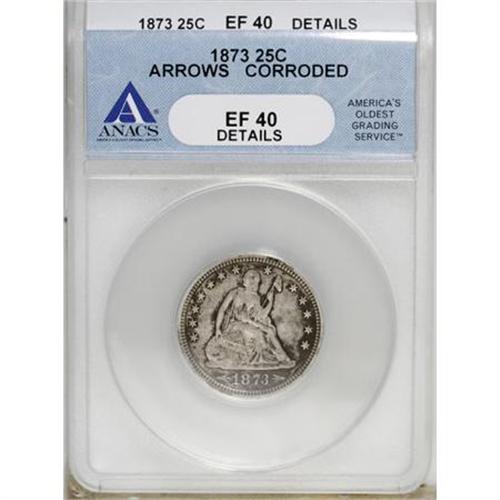 <B>1873 25C Arrows--Corroded--ANACS. XF40 Details.</B></I> NGC Census: (5/164). PCGS Population (3/178). Mintage: 1,271,700. Numismedia Wsl. Price for NGC/PCGS coin in XF40: $200. (#5491)<BR><BR><B>Coin Engraver:</B> Christian Gobrecht<BR><BR><b>Shipping:</b> Coins & Currency (<a target="_blank" href="http://www.heritageauctions.com/common/shipping.php">view shipping information</a>)
