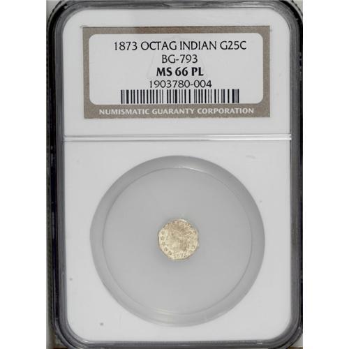 <B>1873 25C Indian Octagonal 25 Cents, BG-793, R.5, MS66 Prooflike NGC.</B></I> The lone Prooflike example certified by NGC, this piece is moderately reflective, and its yellow-gold surfaces shine. Nicely detailed and appealing.<BR><BR><b>Shipping:</b> Coin/Currency (<a target="_blank" href="http://www.heritageauctions.com/common/shipping.php">view shipping information</a>)
