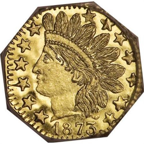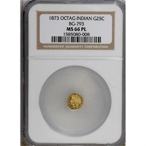 <B>1873 25C Indian Octagonal 25 Cents, BG-793, R.5, MS66 Prooflike NGC.</B></I> A penetrating strike and exceptionally unabraded fields confirm the lofty Premium Gem grade. The wreath and portrait exhibit mild cameo contrast. Slightly wavy, as produced. One of only three examples of the variety certified by NGC (7/07).<BR><BR><b>Shipping:</b> Coins & Currency (<a target="_blank" href="http://www.heritageauctions.com/common/shipping.php">view shipping information</a>)