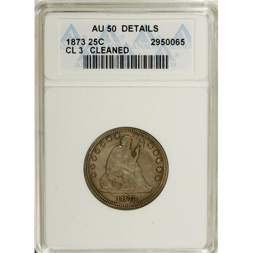 <B>1873 25C Closed 3--Cleaned--ANACS. AU50 Details.</B></I> A cloudy cream-gray representative of this challenging Seated issue. The eagle's plumage and claws are boldly delineated. The right-side stars have slightly soft centers.<BR><I>From The Reginald Byron Mason Collection.</B></I><BR><BR><b>Shipping:</b> Coins & Currency (<a target="_blank" href="http://www.heritageauctions.com/common/shipping.php">view shipping information</a>)