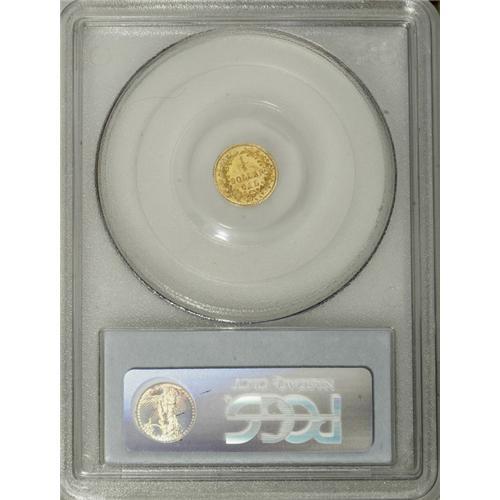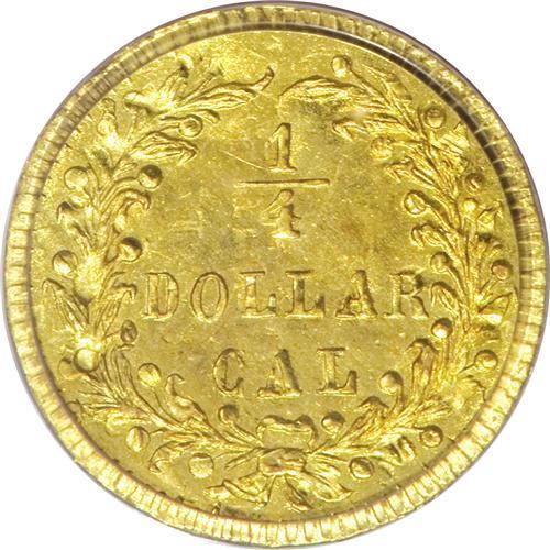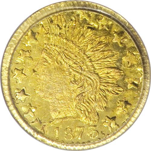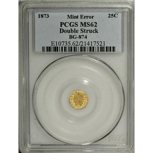 <B>1873 25C Indian Round 25 Cents, BG-874, Low R.6--Double Struck--MS62 PCGS.</B></I> This double struck rare variety small denomination gold piece rotated 180 degrees between strikes. The headdress feathers from the first strike are still visible along the Indian's profile from the second strike. The reverse (anvil die) shows less evidence of the double strike, except a faint DOLLAR is evident, and vertically aligned relative to the bold DOLLAR from the second strike.<BR><BR><b>Shipping:</b> Coins & Currency (<a target="_blank" href="http://www.heritageauctions.com/common/shipping.php">view shipping information</a>)
