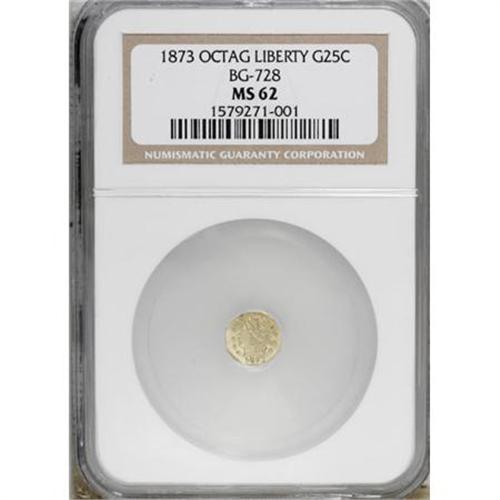 <B>1873 25C Liberty Octagonal 25 Cents, BG-728, R.3, MS62 NGC.</B></I> NGC Census: (3/9). PCGS Population (11/141). (#10555)<BR><BR><b>Shipping:</b> Coins & Currency (<a target="_blank" href="http://www.heritageauctions.com/common/shipping.php">view shipping information</a>)