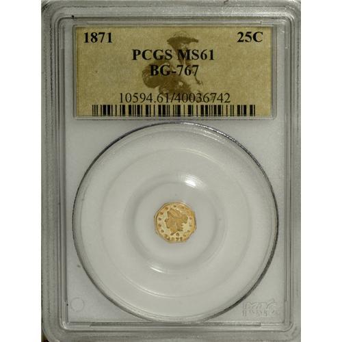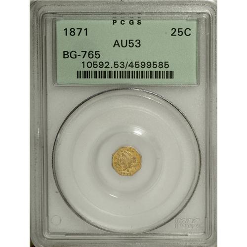 <B>1873 25C Liberty Octagonal 25 Cents, BG-728, R.3, MS64 PCGS,</B></I> rich apricot toning, crisply struck and impressive; <B>1871 Liberty Octagonal 25 Cents, BG-765, R.3, AU53 PCGS,</B></I> minor handling marks, mauve patina on the highpoints, in a green label holder; and an <B>1871 Liberty Octagonal 25 Cents, BG-767, R.3, MS61 PCGS,</B></I> a flashy example with a couple of thin marks near the cheekbone.<BR><BR><b>Shipping:</b> Coins & Currency (<a target="_blank" href="http://www.heritageauctions.com/common/shipping.php">view shipping information</a>)