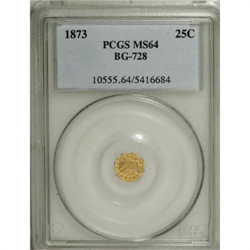 <B>1873 25C Liberty Octagonal 25 Cents, BG-728, R.3, MS64 PCGS.</B></I> PCGS Population (48/61). NGC Census: (1/4). (#10555)<BR><BR><b>Shipping:</b> Coins & Currency (<a target="_blank" href="http://www.heritageauctions.com/common/shipping.php">view shipping information</a>)