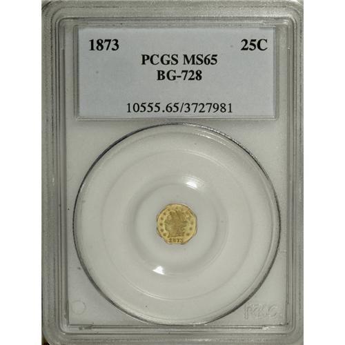 <B>1873 25C Liberty Octagonal 25 Cents, BG-728, R.3, MS65 PCGS.</B></I> This pleasing Gem has original dusky olive-gold toning. The strike is decisive, and inspection beneath a loupe fails to locate any marks.<BR><BR><b>Shipping:</b> Coins & Currency (<a target="_blank" href="http://www.heritageauctions.com/common/shipping.php">view shipping information</a>)