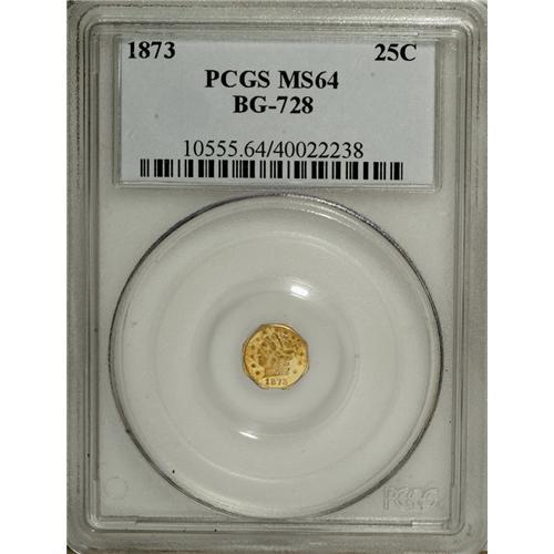 <B>1873 25C Liberty Octagonal 25 Cents, BG-728, R.3, MS64 PCGS.</B></I> PCGS Population (48/61). NGC Census: (1/4). (#10555)<BR><BR><b>Shipping:</b> Coins & Currency (<a target="_blank" href="http://www.heritageauctions.com/common/shipping.php">view shipping information</a>)