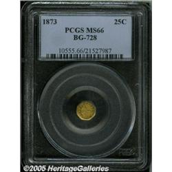 <B>1873 25C Liberty Octagonal 25 Cents, BG-728, R.3, MS66 PCGS.</B></I> The radiant orange color cedes to occasional gunmetal-blue hues. Boldly struck, since the central reverse shows only the slightest softness of impression. Population: 20 in 66, 2 finer (2/05).