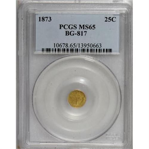 <B>1873 25C Liberty Round 25 Cents, BG-817, R.3, MS65 PCGS.</B></I> A satiny green-gold Gem with unperturbed fields and minor inexactness of strike on the forehead curls and central reverse. Population: 17 in 65, 2 finer (8/07).<BR><BR><b>Shipping:</b> Coins & Currency (<a target="_blank" href="http://www.heritageauctions.com/common/shipping.php">view shipping information</a>)