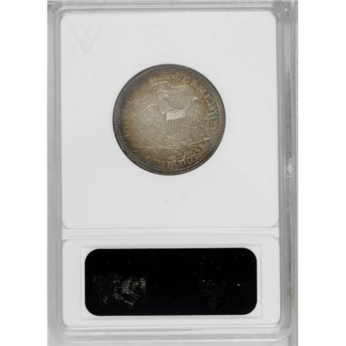 <B>1873<25C> No Arrows PR64 ANACS.</B></I> Closed 3. As they were delivered early in the year, all proof 1873 No Arrows quarters display a Closed 3 in the date. This crisply detailed example has lovely cream-gray toning over the obverse and a pleasing combination of speckled golden-brown, magenta, and cobalt-blue coloration on the reverse. Well preserved and free of troubling hairlines or handling marks. The subdued reflectivity in the toned fields probably kept this piece from a Gem holder, but it is still a very attractive specimen.
