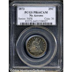 <B>1873<25C> No Arrows PR64 Cameo PCGS.</B></I> The design elements are boldly impressed throughout, and bright surfaces radiate through the golden-brown coloration accented by blue and lavender hues. While no abrasions are evident, a few wispy hairlines, especially in the obverse fields, help to account for the grade. Population: 6 in 64, 1 finer (3/04). <BR><BR><B>Important notice:</B> Heritage usually auctions material at the rate of 200-250 lots per hour. On some occasions eBay Live bid software or the Internet may not be able to keep up with the pace of the auction. We recommend placing a realistic absentee bid now as insurance to avoid disappointment. Occasionally the auctioneer may eliminate or reject an eBay Live bid, and the auctioneer may also reopen a lot after the close of the eBay live bidding (usually because we missed an audience bid), and may reject your bid even if it shows you as the winning bidder. By bidding via eBay Live, you agree that Heritage may award the lot to another bidder at its sole discretion under the circumstances described above or any other reasonable circumstances. Since eBay bids are not shown to us until we open the lot on the floor, we treat those bids just like floor bids. In most cases the floor responds before the eBay bid is presented to us, due to Internet lag time, so for consistency we have made it a policy that floor bids are always considered first over tie eBay live bids. Also please note that all Heritage lots purchased through eBay Live carry a 20% Buyer's Premium. Please make sure you read the Terms and Conditions before you bid.