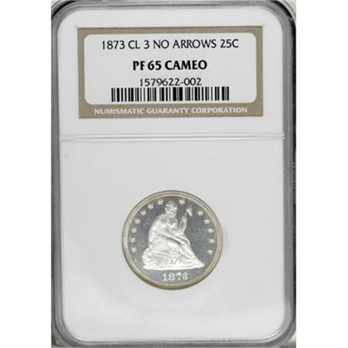 <B>1873 25C No Arrows PR65 Cameo NGC.</B></I> Closed 3 in date as always. This glorious Gem has full proof brilliance framed by subtle gold toning along the borders. Both sides have deeply mirrored fields, surrounding lustrous devices. It is an excellent cameo proof that presents exceptional eye appeal. Census: 3 in 65 Cameo, 3 finer (1/08).<BR><BR><b>Shipping:</b> Coins & Currency (<a target="_blank" href="http://www.heritageauctions.com/common/shipping.php">view shipping information</a>)
