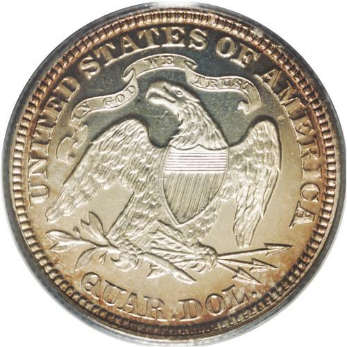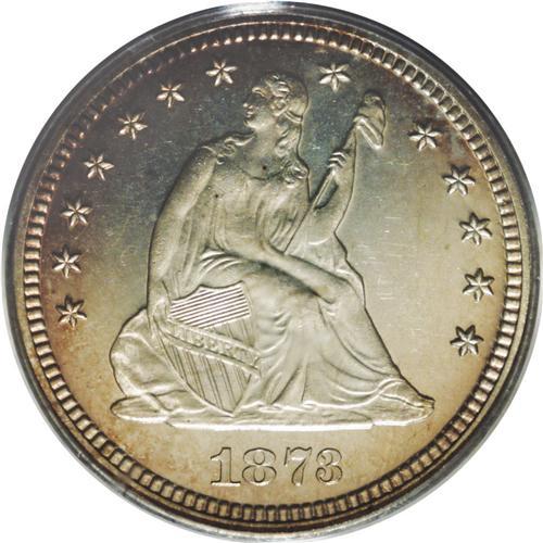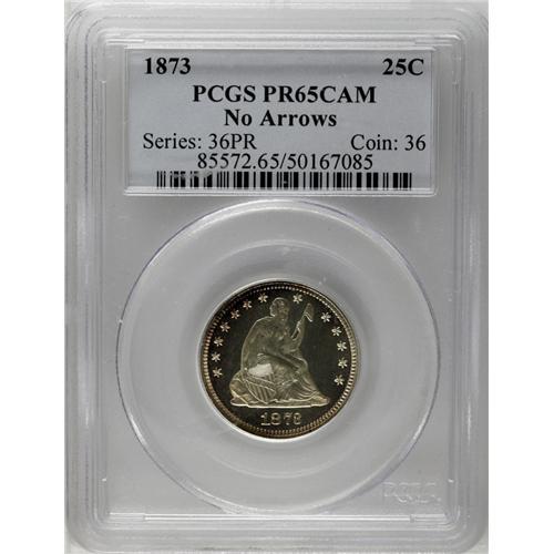<B>1873<25C> No Arrows PR65 Cameo PCGS.</B></I> Light rose toning enriches the rims, while the remainder of this needle-sharp Gem is brilliant. 600 Closed 3, No Arrows proofs were struck. Later that year, Open 3, No Arrows business strikes (but no proofs) were coined. Finally, arrows were added to the date to reflect a tiny weight change, and further proofs and commercial strikes were issued. Census: 2 in 65 Cameo, 3 finer (6/06).<BR><I>From The Mulholland Collection.</B></I>