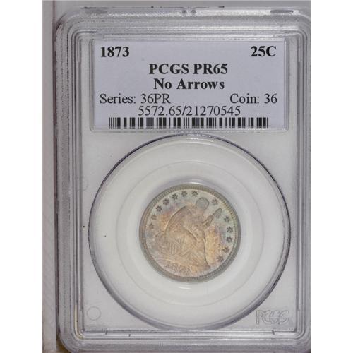 <B>1873<25C> No Arrows PR65 PCGS.</B></I> Crisply detailed with pleasing blue-gray and gold color variations on the obverse, and even bluish-gray toning over the reverse. The fields are suitably reflective on the obverse, if somewhat muted on the reverse, and the well preserved proof surfaces are free of bothersome contact marks or hairlines. Population: 10 in 65, 3 finer (1/06).