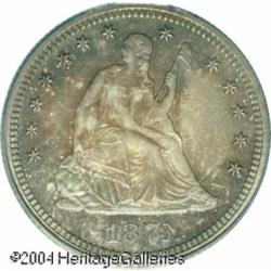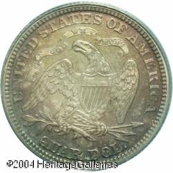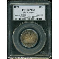 1873 25C No Arrows PR66 PCGS. Only 600 proof No Ar <B>1873 25C No Arrows PR66 PCGS.</B></I> Only 600 proof No Arrows Quarters were minted this year minus an undetermined number that were melted after July 10. This is a pristine example displaying fields that are highly reflective while the devices show a moderate amount of contrasting mint frost as the coin is turned under a light. Each side is colorfully toned in circling shades of electric-blue, magenta, and peach. Population: 2 in 66, 2 finer (11/04). <BR><BR><B>Important notice:</B> Heritage usually auctions material at the rate of 200-250 lots per hour. On some occasions eBay Live bid software or the Internet may not be able to keep up with the pace of the auction. We recommend placing a realistic absentee bid now as insurance to avoid disappointment. Occasionally the auctioneer may eliminate or reject an eBay Live bid, and the auctioneer may also reopen a lot after the close of the eBay live bidding (usually because we missed an audience bid), and may reject your bid even if it shows you as the winning bidder. By bidding via eBay Live, you agree that Heritage may award the lot to another bidder at its sole discretion under the circumstances described above or any other reasonable circumstances. Since eBay bids are not shown to us until we open the lot on the floor, we treat those bids just like floor bids. In most cases the floor responds before the eBay bid is presented to us, due to Internet lag time, so for consistency we have made it a policy that floor bids are always considered first over tie eBay live bids. Also please note that all Heritage lots purchased through eBay Live carry a 20% Buyer's Premium. Please make sure you read the Terms and Conditions before you bid. This lot is being auctioned in conjunction with a live floor auction by Heritage Galleries & Auctioneers. All final auction and invoice information will be supplied by Heritage Galleries & Auctioneers, and all other information should be considered preliminary. Lot:5896