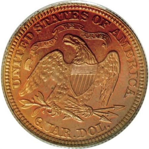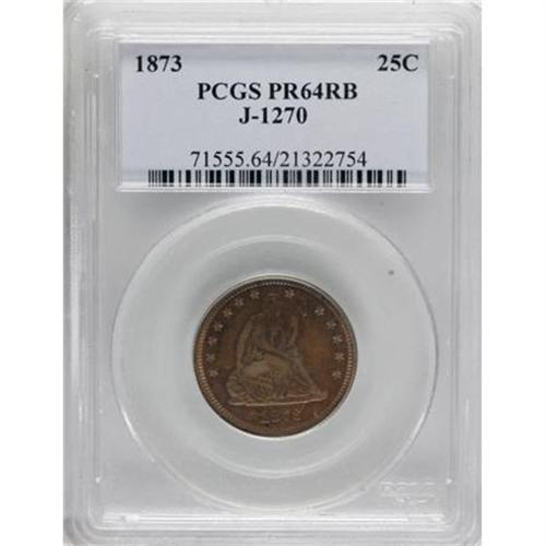 <B>1873 25C Quarter Dollar, Judd-1270, Pollock-1412, High R.7, PR64 Red and Brown PCGS.</B></I> The obverse and reverse design is the same as that used to coin regular issue Closed-3, No Arrows type 1873 quarter dollars. Struck from copper with a reeded edge. This example is fully detailed, with appealing red-orange and aqua-blue surfaces that are free from abrasions. A few small carbon spots decide the grade. The only specimen of this variety to be graded by PCGS. Population: 1 in 64, 0 finer (5/07).<BR><I>Ex: Empire Coin Co.; Bowers and Ruddy, 3/81, lot 626; John E. Drew Collection; Bowers and Merena, 3/96, lot 2052; Bowers and Merena, 1/97, lot 457; Heritage, 11/03, lot 11196; Stack's, 9/05, lot 1707.</B></I><BR><BR><b>Shipping:</b> Coins & Currency (<a target="_blank" href="http://www.heritageauctions.com/common/shipping.php">view shipping information</a>)