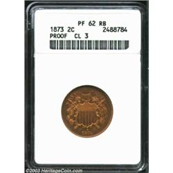 1873 2C Closed 3 PR62 Red and Brown ANACS. Bright orange-gold color, with a blush of ruby-red hues near the denomination. Exquisitely struck and well preserved for the grade. The reverse has a miniscule carbon fleck. A proof-only issue from the final year of the denomination.From the Dr. Richard Tavernetti Collection. Important notice: We expect to be auctioning lots at the rate of 200-250 per hour. On occasion eBay live bid software cannot keep up with the pace of the auctions where 4-5 lots per minute can hammer down, so we recommend that you place a realistic absentee bid now as insurance to avoid disappointment. Also please note that all Heritage/CAA lots purchased through eBay Live carry a 20% Buyer's Premium. Please make sure you read the Terms and Conditions.