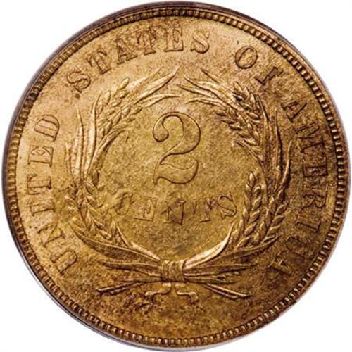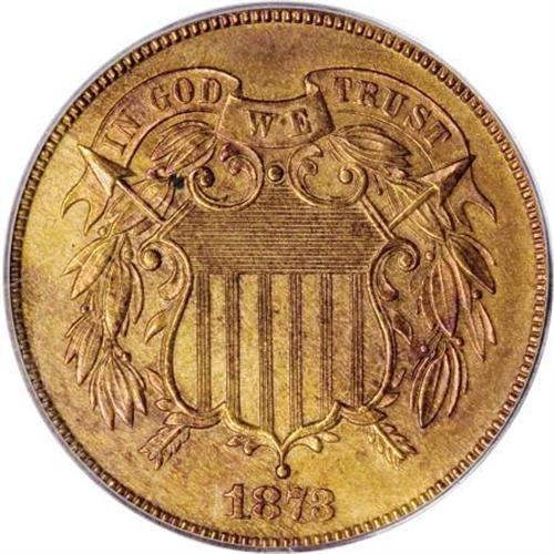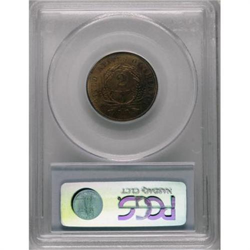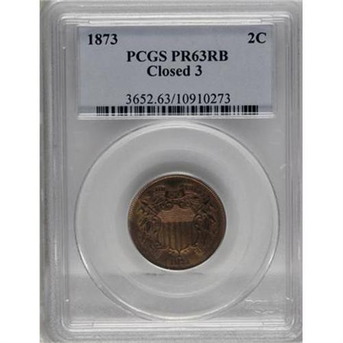 <B>1873 2C Closed 3 PR63 Red and Brown PCGS.</B></I> The reverse has a bit of woodgrain effect, while the obverse has a streak of tan-gold amid some darker auburn-red. A couple of small carbon flecks are well hidden in the devices, but the coin retains a pleasing amount of appeal. The Closed 3 pieces are the originals, according to Breen, with the Open 3 coins restrikes made at a later time.<BR><BR><B>Coin Engraver:</B> James B. Longacre<BR><BR><b>Shipping:</b> Coins & Currency (<a target="_blank" href="http://www.heritageauctions.com/common/shipping.php">view shipping information</a>)