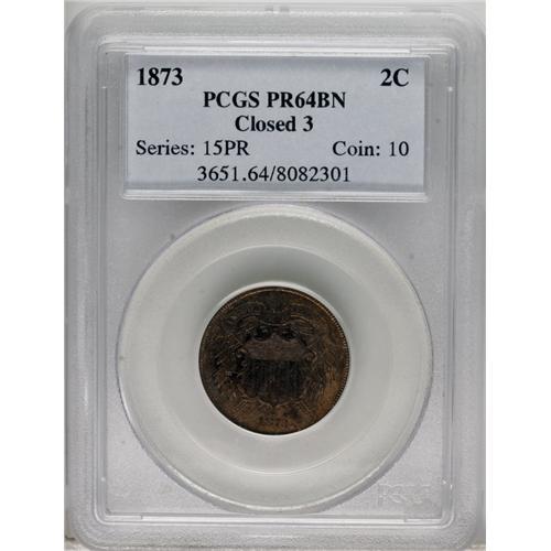 <B>1873 2C Closed 3 PR64 Brown PCGS.</B></I> Well struck and nicely preserved, this near-Gem proof specimen has a rather dense layer of speckled patina over both sides, which lightens somewhat near the peripheries. There are no bothersome handling marks or hairlines to be found, and the design elements are crisply produced. A scarce, proof-only, final-year issue. Population: 29 in 64 Brown, 11 finer (2/07).<BR><BR><b>Shipping:</b> Coins & Currency (<a target="_blank" href="http://www.heritageauctions.com/common/shipping.php">view shipping information</a>)
