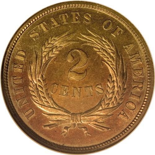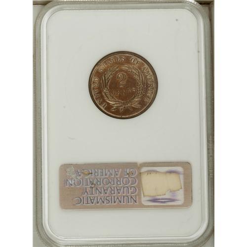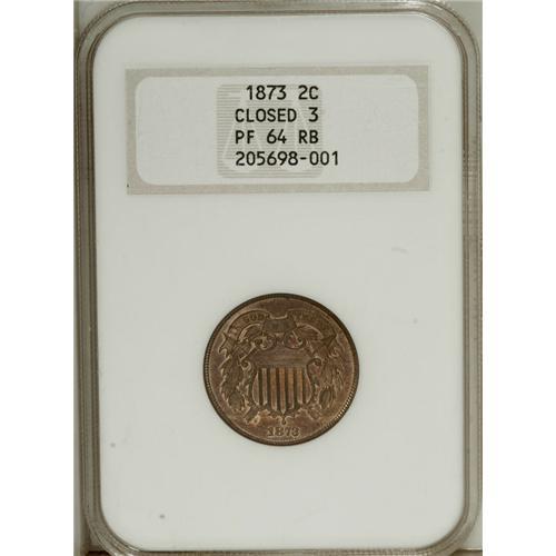 <B>1873<2C> Closed 3 PR64 Red and Brown NGC.</B></I> The 1873 Closed 3 two cent piece is somewhat more frequently encountered than the Open 3 variety, but both are the keys to the series, along with the 1864 Small Motto. Breen's proof <I>Encyclopedia</B></I> calls the Open 3 pieces restrikes. This example offers mellow orange-gold patina with brilliantly mirrored surfaces that have some cameo contrast, although not noted on the holder.